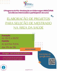 O Programa de Pós-Graduação em Enfermagem (PPGENF/INISA-UFMS) convida interessados a participarem do curso “Elaboração de Projetos para Seleção de Mestrado na Área da Saúde”, que tem como objetivo auxiliar candidatos na construção de projetos de pesquisa voltados para processos seletivos de programas de mestrado na área da saúde.