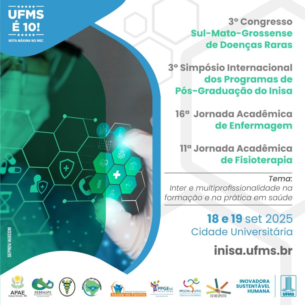 3º Congresso Sul Mato-Grossense de Doenças Raras; 3º Simpósio Internacional dos Programas de Pós-Graduação do Inisa; 16ª Jornada Acadêmica de Enfermagem; 11ª Jornada Acadêmica de Fisioterapia
