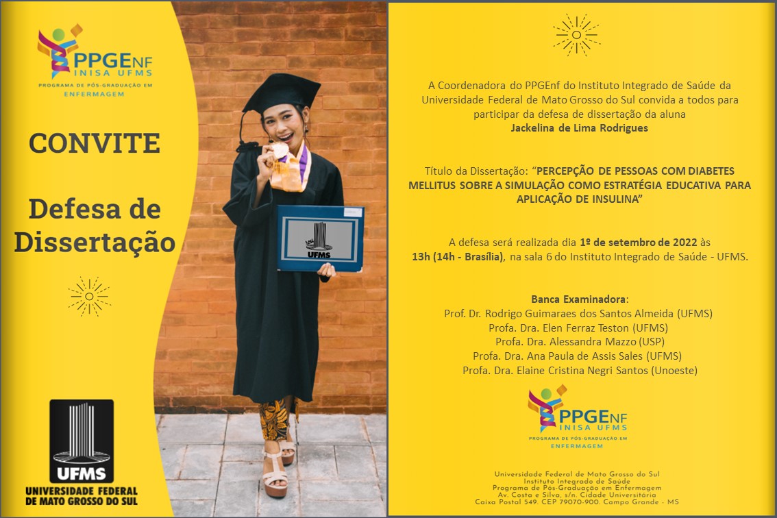 A Coordenação do PPGEnf do Instituto Integrado de Saúde da Universidade Federal de Mato Grosso do Sul convida a todos para participar da defesa de dissertação da aluna Jackelinade Lima Rodrigues.