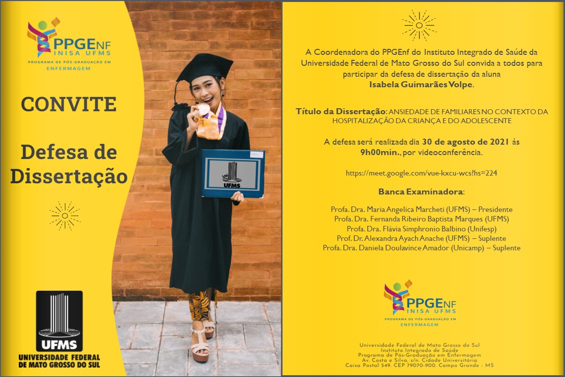 “A Coordenadora do PPGEnf do Instituto Integrado de Saúde da Universidade Federal de Mato Grosso do Sul convida a todos para participar da defesa de dissertação da aluna Isabela Guimarães Volpe.”