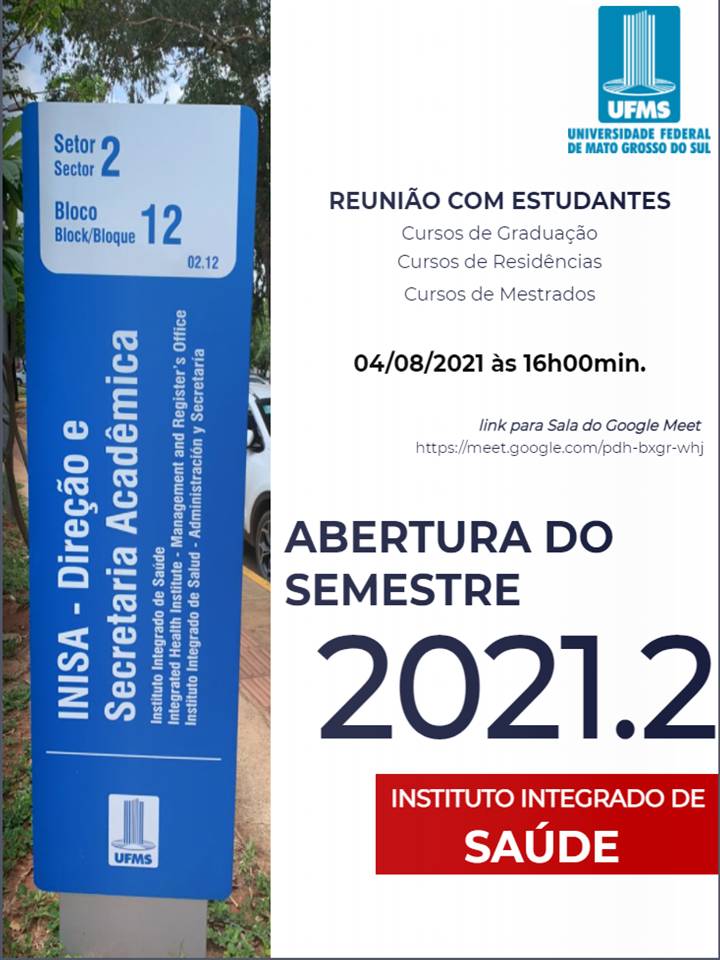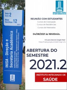 No dia 4 de agosto de 2021, foi realizada Reunião da Direção do Instituto Integrado de Saúde (Inisa) com os discentes dos cursos de Graduação, Pós-Graduação e Residências, com ampla participação da comunidade acadêmica. Em virtude da limitação da capacidade de participantes na plataforma Google Meet e da grande adesão dos discentes, os interessados podem acessar a íntegra da reunião pelo link abaixo.